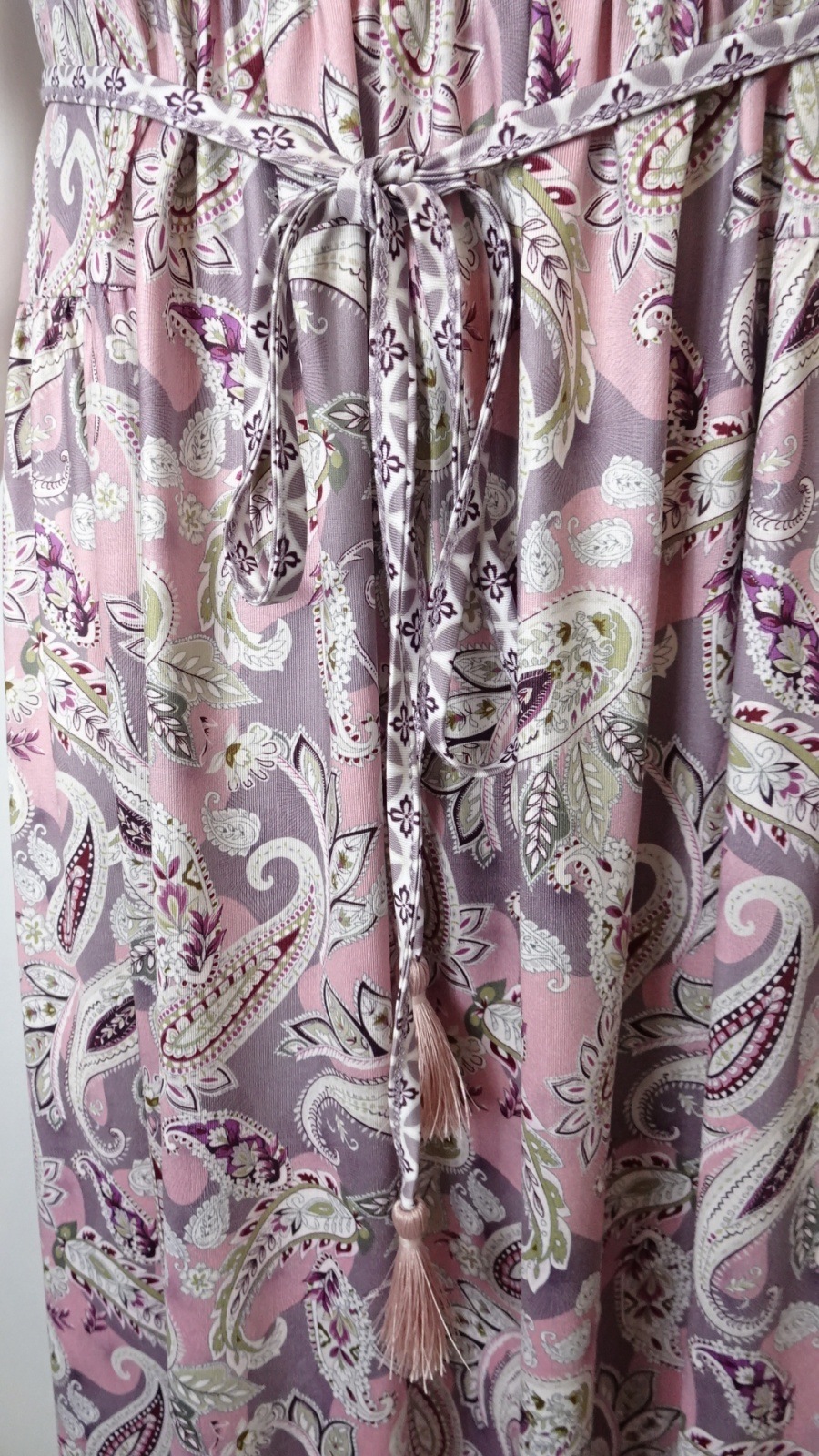 ウエストにはタッセル付きの紐ベルトをあしらい、さりげないアクセントとシルエット調整の