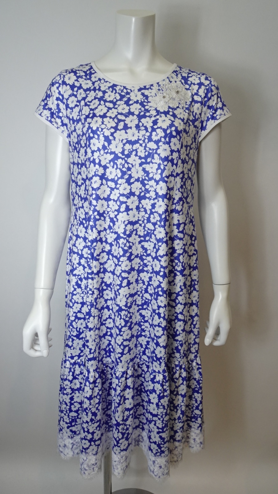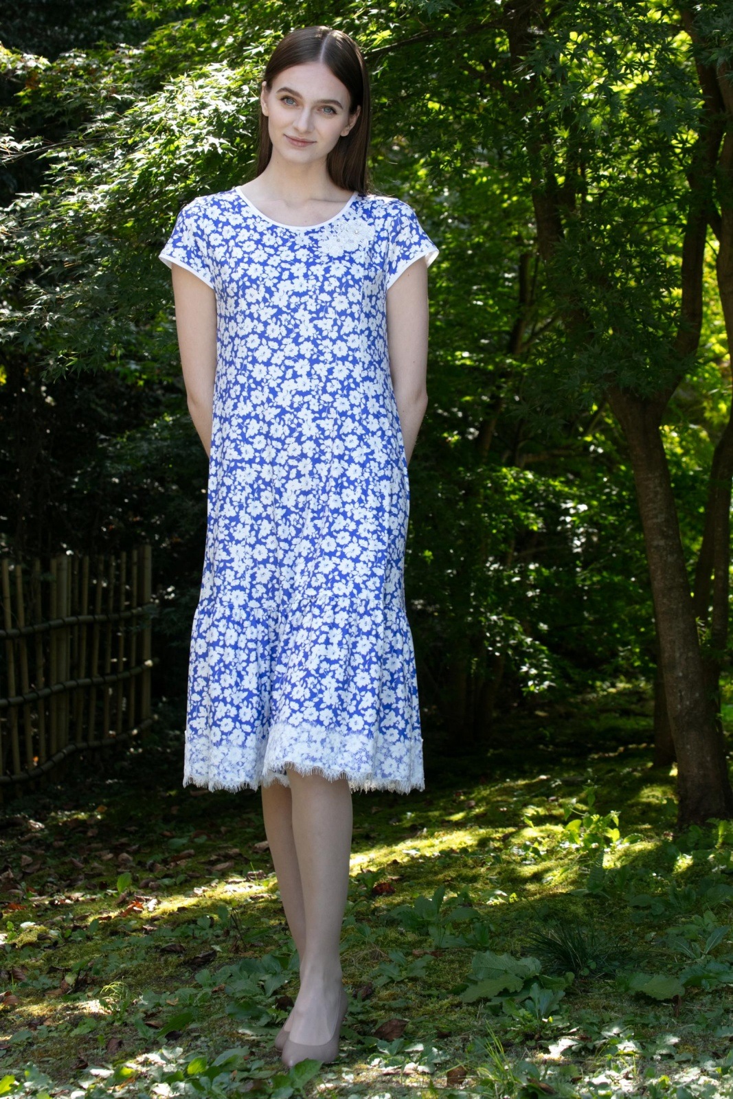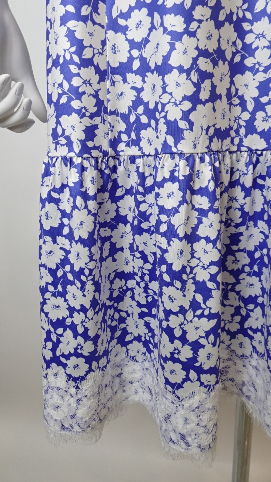 2026年春夏物 ブルー系フラワープリント 裾レース使いワンピース 2616038 3月納品予定