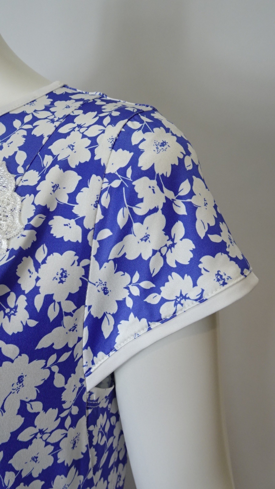 鮮やかなブルーに映える白のフラワープリントが、夏の光に映える爽やかな存在感を演出します。