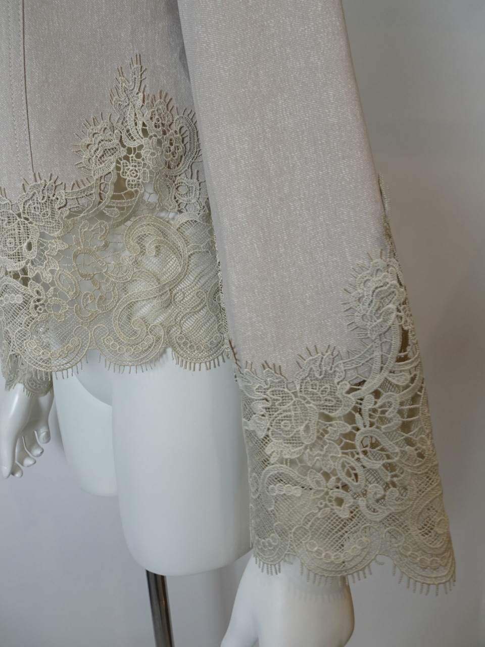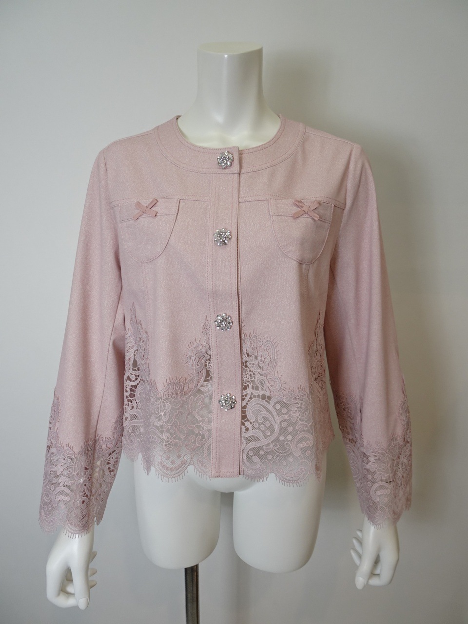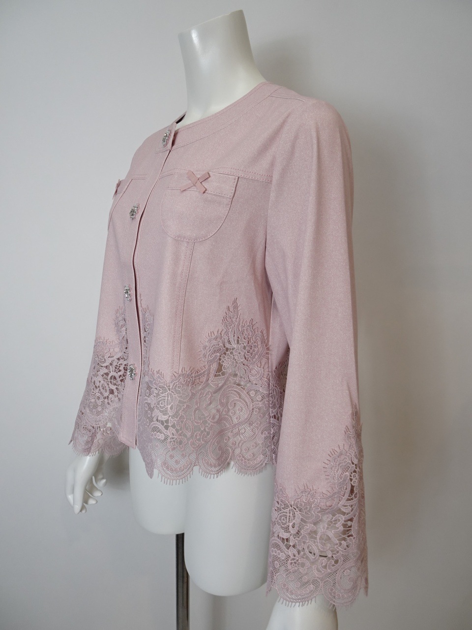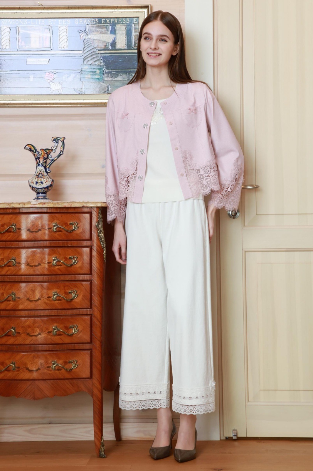 裾と袖口には繊細なレースをあしらい、胸元の小さなリボンとビジュー付きのボタンが、さりげない華やかさを添えます。甘くなりすぎず、上品で女性らしい印象に仕上げました。