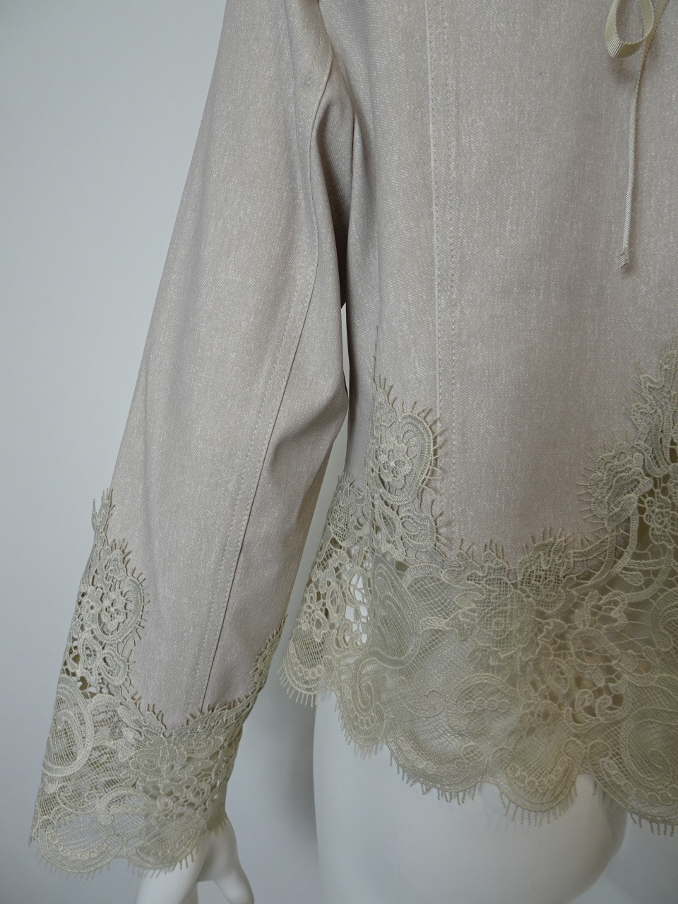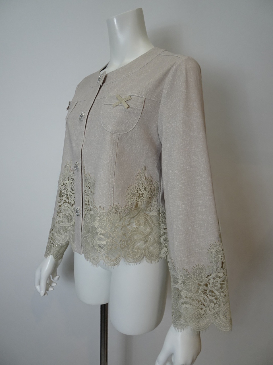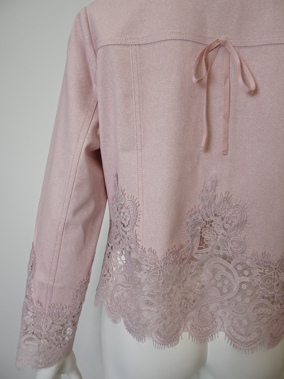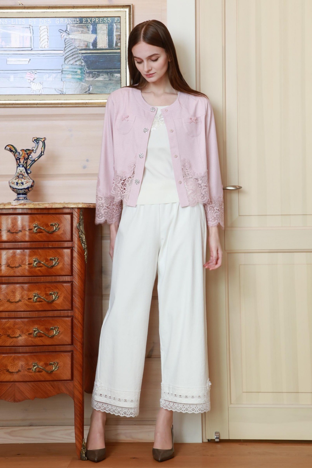 裾と袖口には繊細なレースをあしらい、胸元の小さなリボンとビジュー付きのボタンが、さりげない華やかさを添えます。甘くなりすぎず、上品で女性らしい印象に仕上げました。