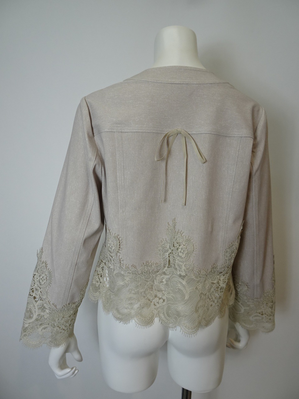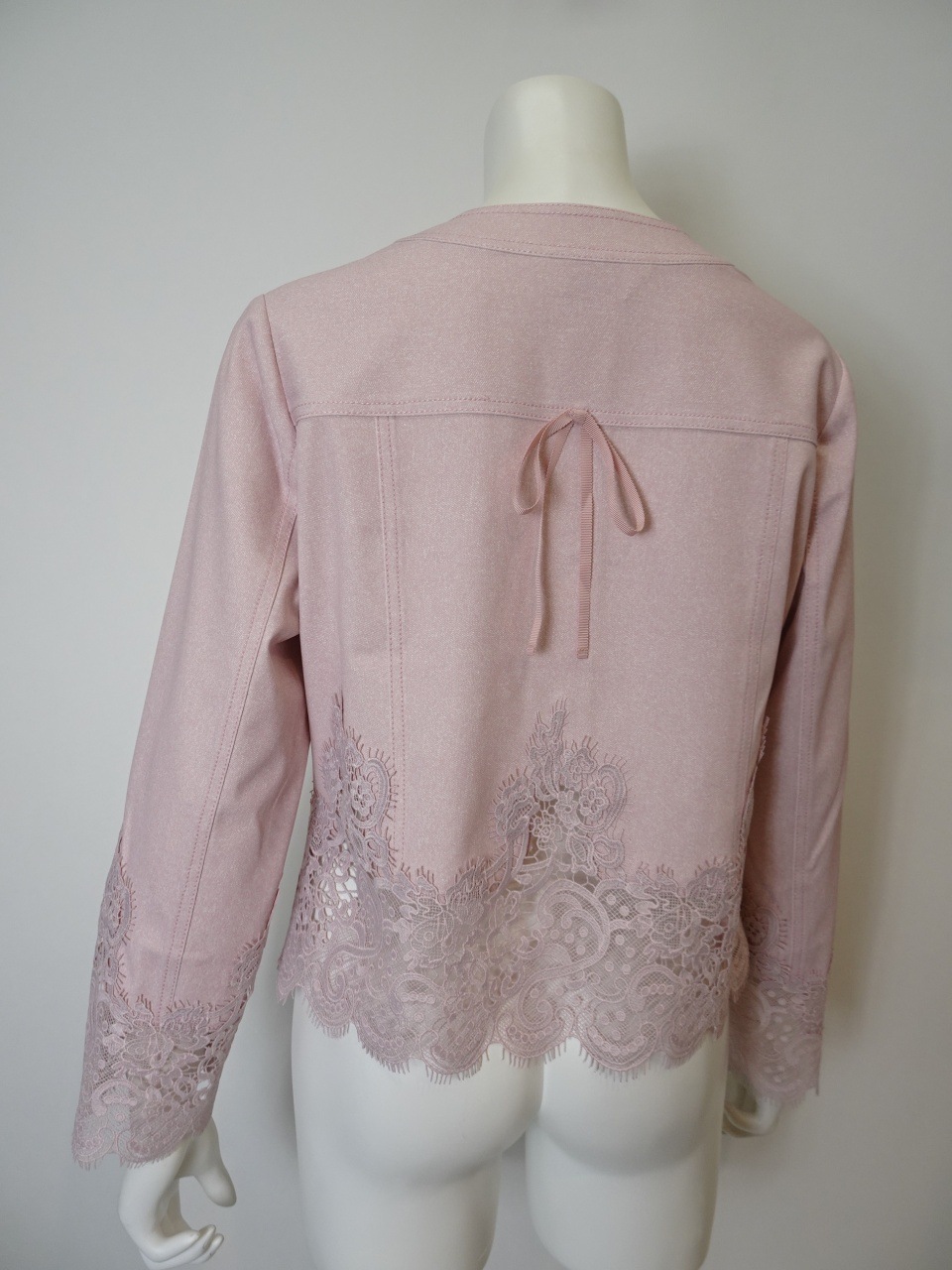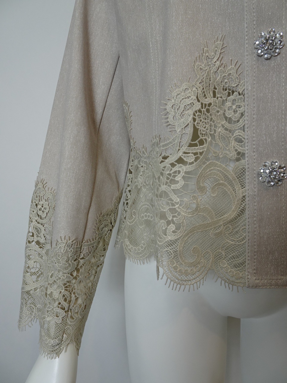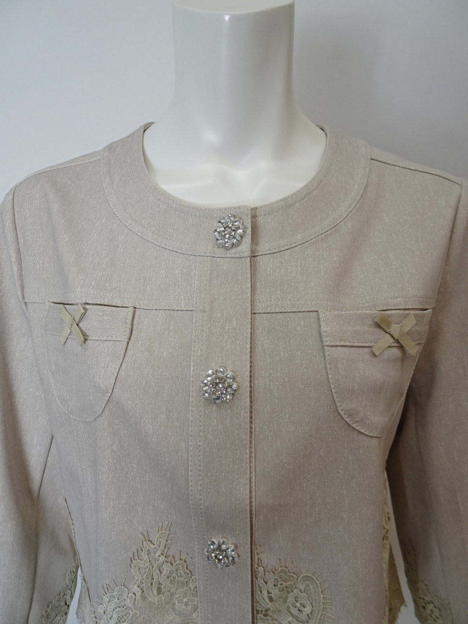 裾と袖口には繊細なレースをあしらい、胸元の小さなリボンとビジュー付きのボタンが、さりげない華やかさを添えます。甘くなりすぎず、上品で女性らしい印象に仕上げました。