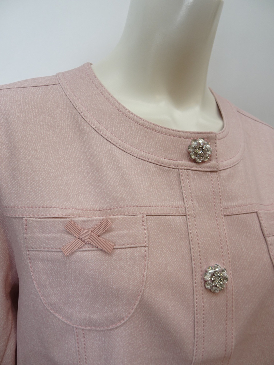 すっきりとしたノーカラーデザインが、顔まわりを明るく見せてくれるジャケット。