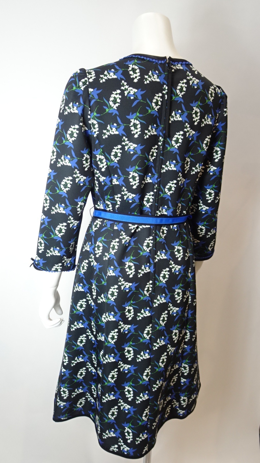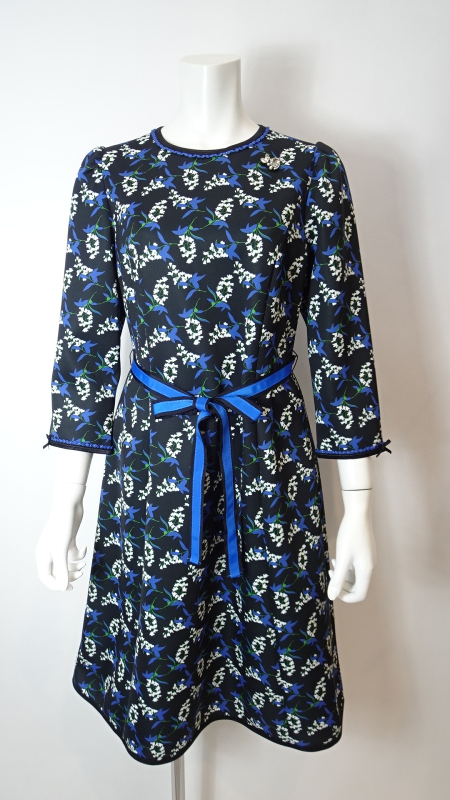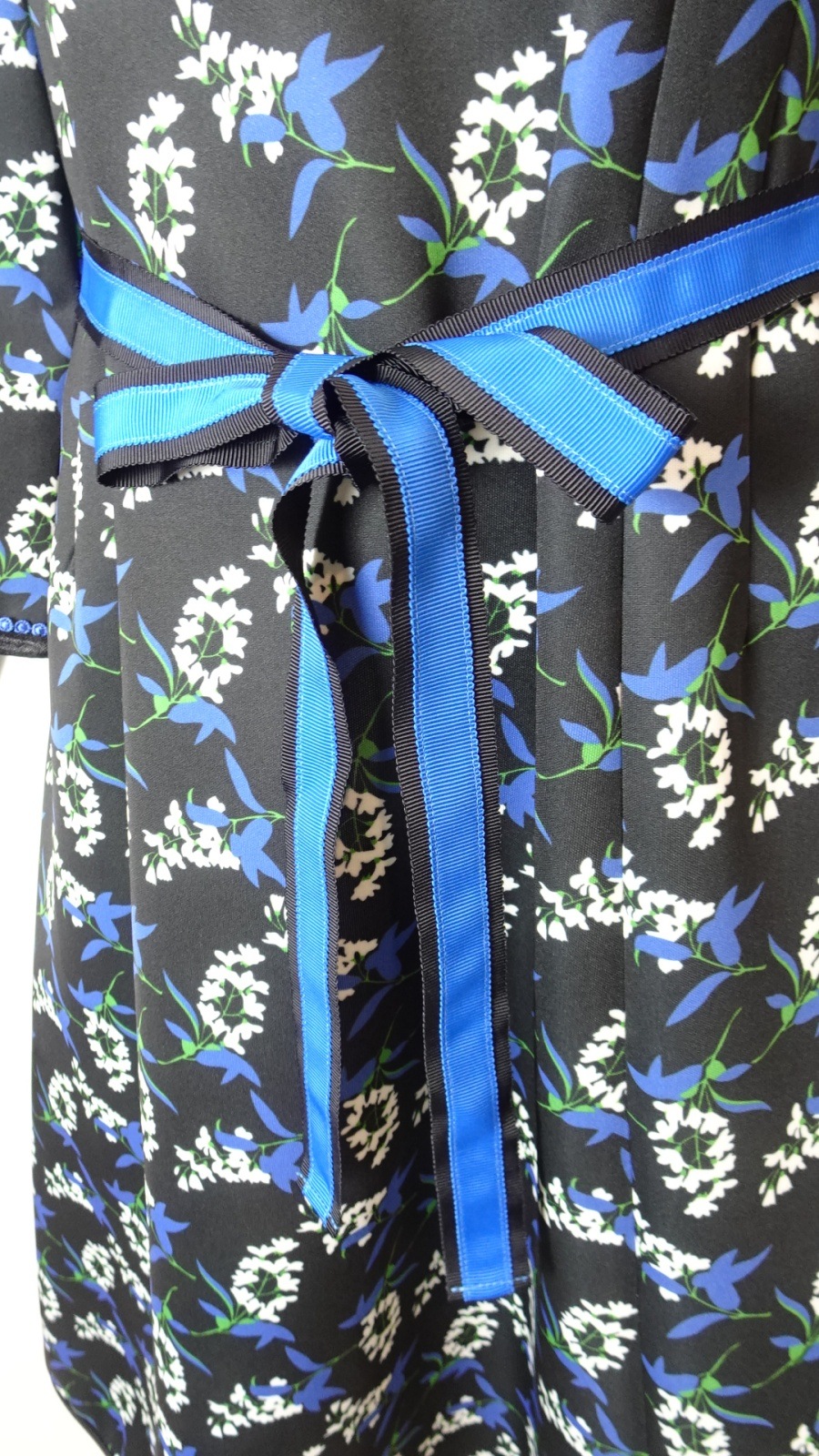さらに、ベルト部分は黒地にブルーのリボンの2色展開で、おしゃれなアクセントとなっています。このワンピースは、フォーマルな場面からカジュアルな日常のお出かけまで、さまざまなシーンで活躍します。