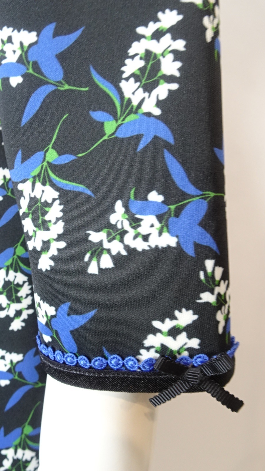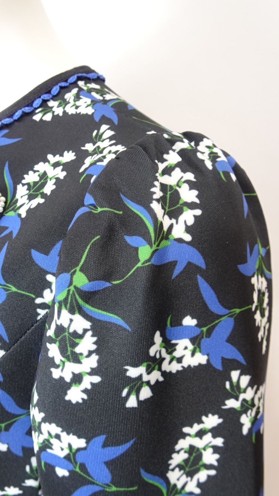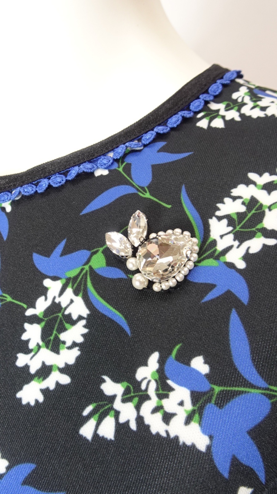 美しいサテン調のパイピングが施された首元は、ブルーのピコットレースと共にフェミニンな上品さをプラスし、胸元にはビジューが華やかに彩ります。袖口にも、首元と同じ生地でパイピングを施し、小さなリボン飾りを添えることで、女性らしさと可愛らしさを兼ね備えた仕上がりとなっています。